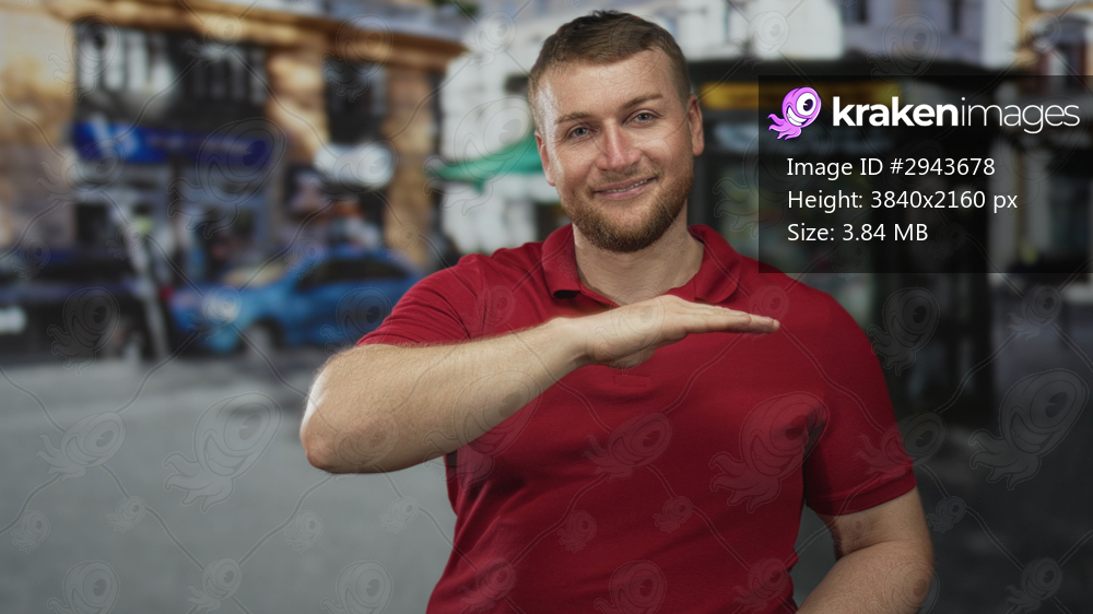 Man in red polo holds hands level as if framing an invisible box on street near kiosk and parked car; confidence ease.