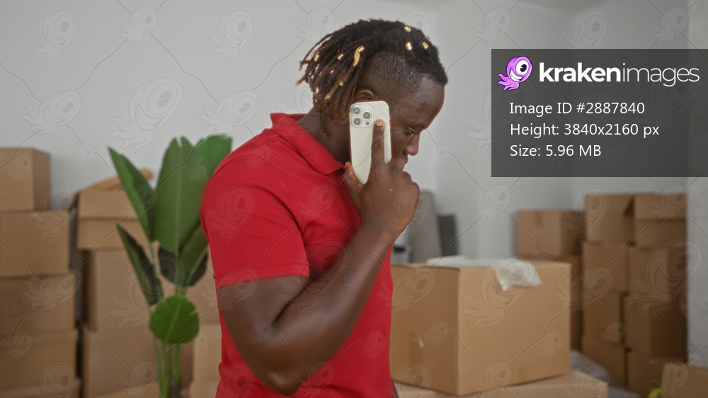 Man in red polo holds phone to ear in house surrounded by packed moving boxes and plants; moving stress.