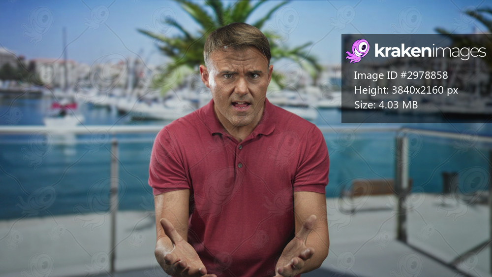 Man in red polo with open palms gesturing toward camera on a waterfront street by a marina with boats, water and a palm tree; concern appeal.