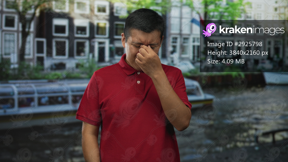 Man in red polo pinches nose with hand beside canal tour boat near amsterdam building facades; odor discomfort.