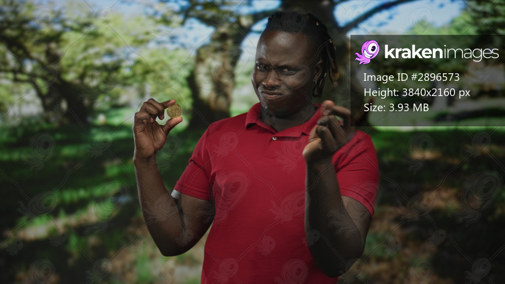 Man in red polo pointing finger at small gold coin held between thumb and forefinger in forest scene; doubt value.