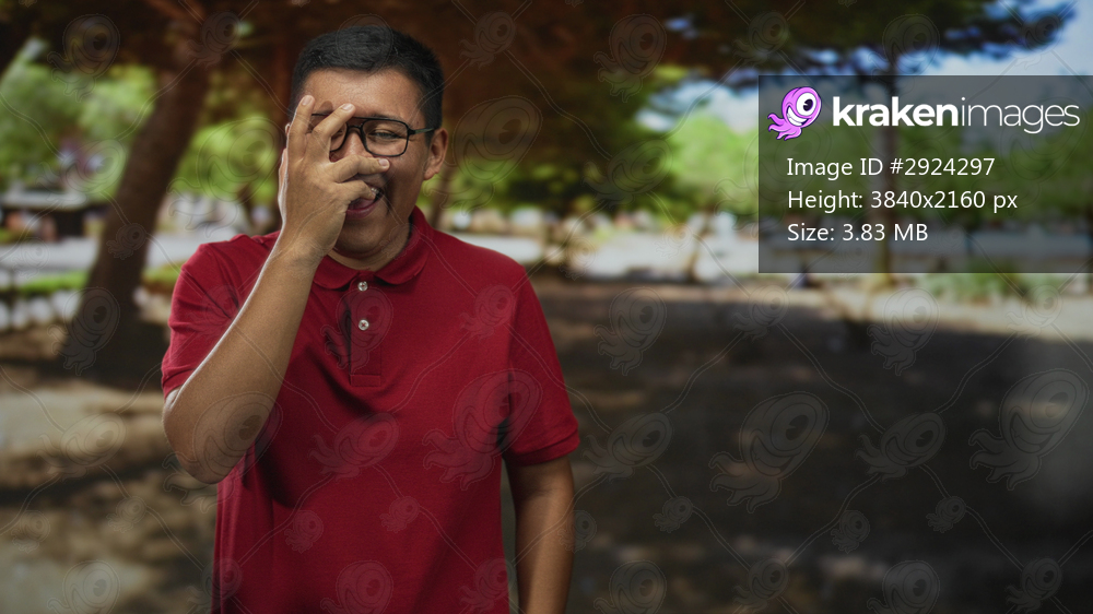 Man in red polo shirt and glasses covering face with hand while laughing in park among trees and green grass; happiness leisure.
