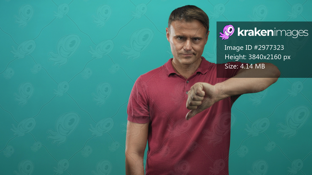Man in red polo shirt showing thumbs down with bare thumb and forearm against teal studio backdrop; disapproval.