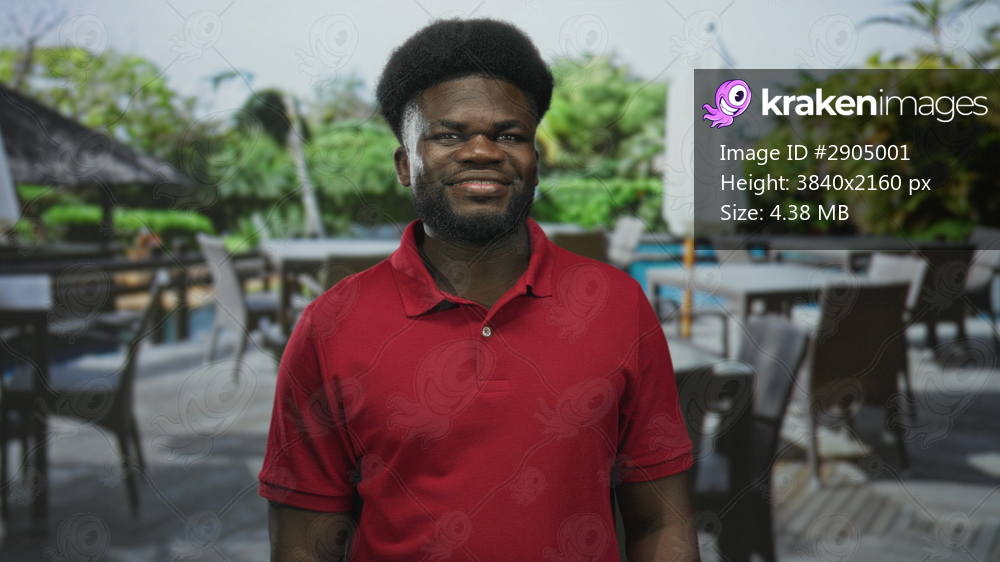 Man in red polo shirt smiling with visible face and eyes closed near poolside building at resort; serenity relaxation vacation.
