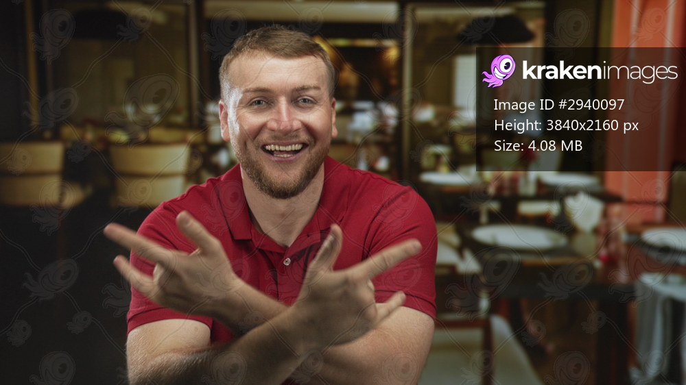 Man in red polo showing rock horns with crossed hands and tongue out in restaurant; playful party fun.