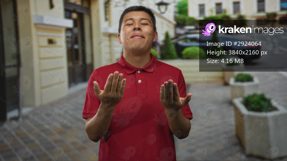 Man in red polo shows both middle fingers smiling on cobblestone street outside building; defiance bold attitude.