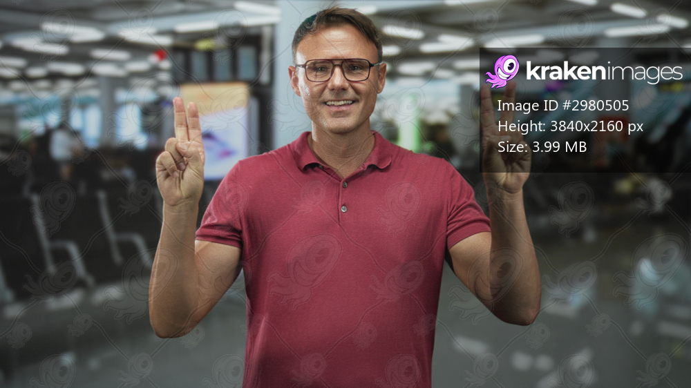 Man in red polo shows peace sign with both hands at busy airport terminal, smiling and wearing glasses; travel optimism.