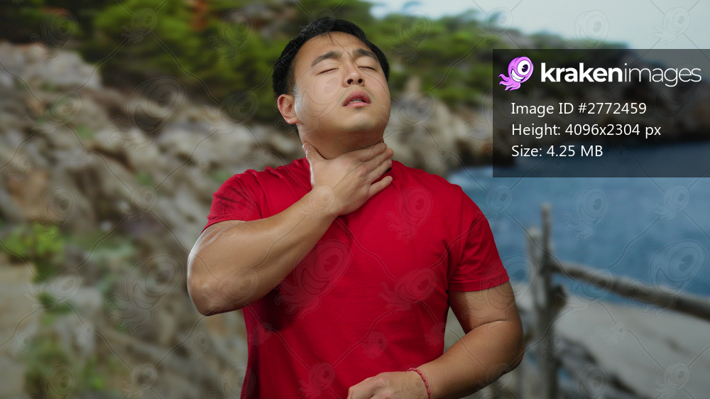Man in red shirt at beach holding throat, suggesting discomfort or health issue, contrasted by calm seaside, rocks, and greenery, conveying a serene yet concerned vibe. - Kraken Images