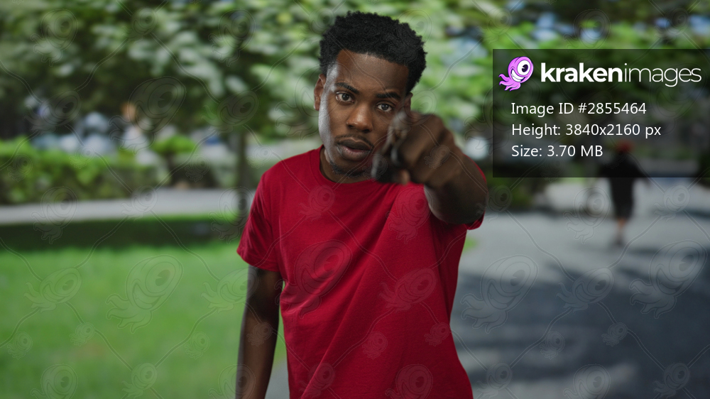 Man in red shirt beckons with finger in park pathway under green trees and sunlight; friendly invitation.