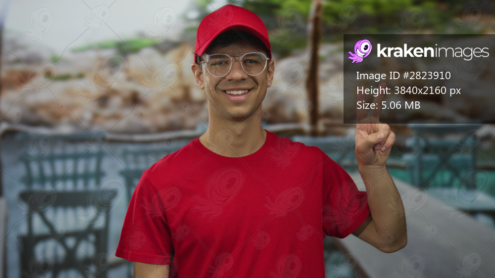 Man in red shirt and cap shows victory sign with a bright smile on terrace restaurant outdoors; peace.