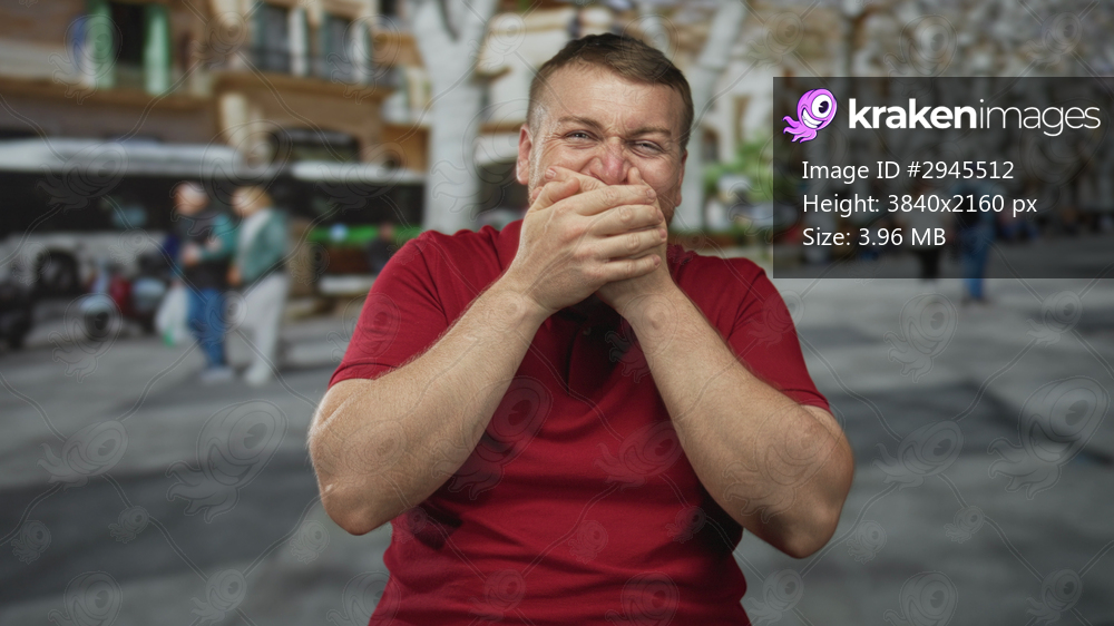 Man in red shirt covering mouth with both hands on a crowded city street near a bus and walking pedestrians; laughter.