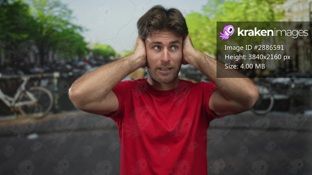 Man in red shirt covers ears with hands on amsterdam canal street lined with bicycles and riverside buildings, showing discomfort and raised eyebrows; frustration. - Kraken Images