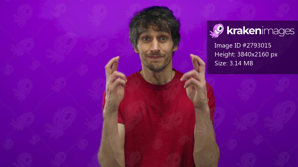 Man in red shirt with crossed fingers gesture in purple studio setting with eyes closed and slight smile, conveying anticipation; hope.