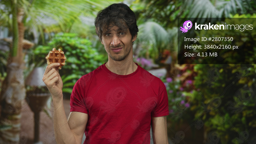 Man in red shirt frowns while holding waffle by hand among tropical foliage in lush green park at midday; disgust.