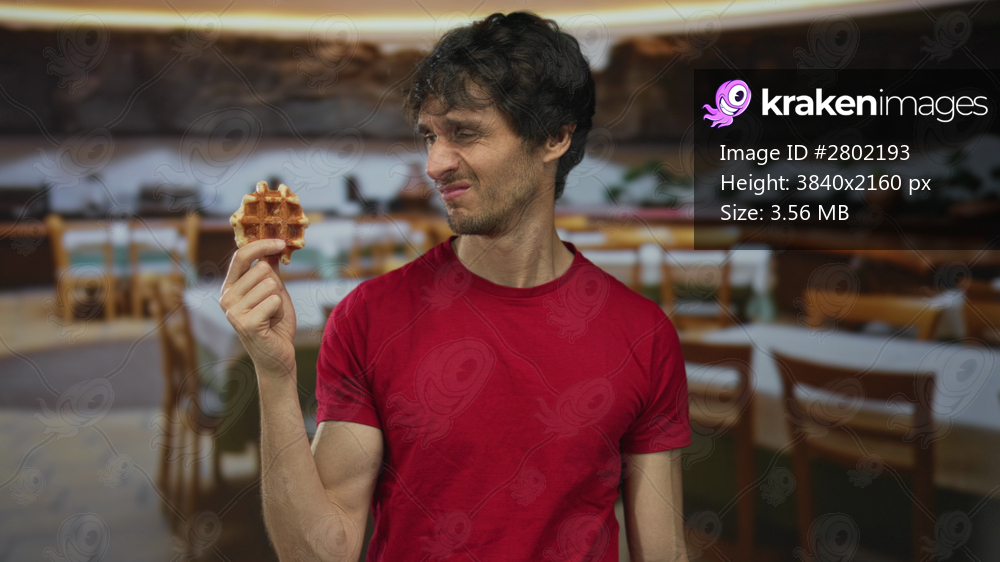 Man in red shirt grimacing at half eaten waffle while standing beside wooden table in restaurant; disgust reaction.