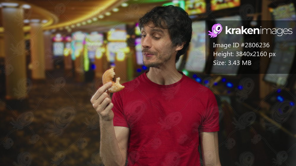 Man in red shirt holding donut chewing in casino against bright row of slot machine screens; satisfaction.