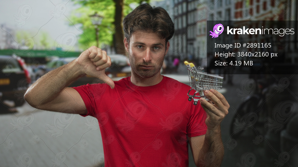 Man in red shirt holding miniature shopping cart and showing thumbs down on a street; consumer dissatisfaction disappointment.