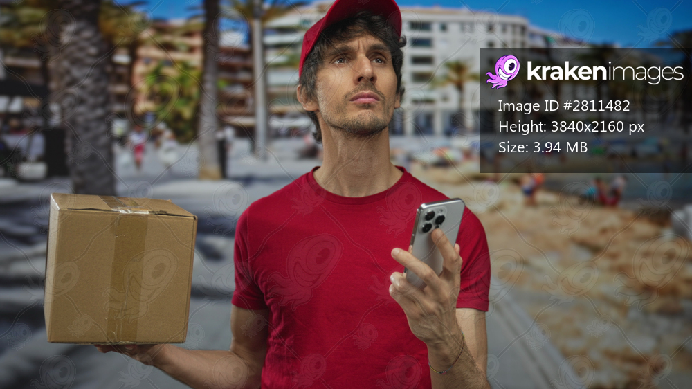 Man in red shirt holds package, scrolls smartphone and tilts head upward on street; anticipation convenience connection.