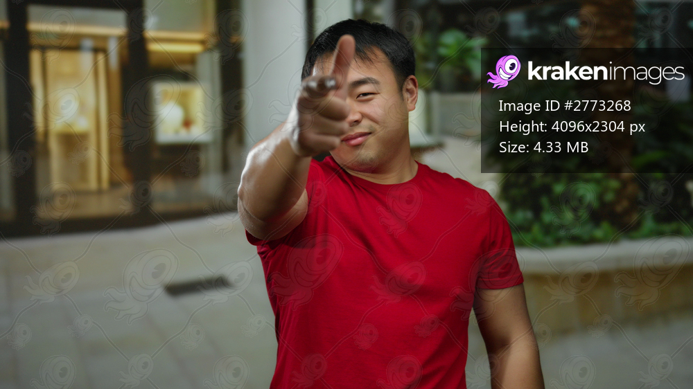 Man in red shirt making finger gun gesture smiling confidently in urban environment with greenery and modern architecture background.
