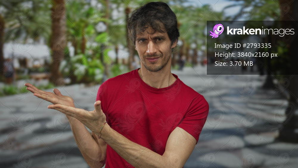 Man in red shirt pointing with both hands on a sunlit urban street lined with palm trees; uncertainty.
