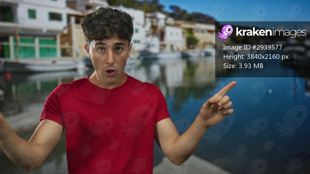 Man in red shirt points index finger forward at boats by a seaside building pier, finger raised near chest and solemn face; concern safety.