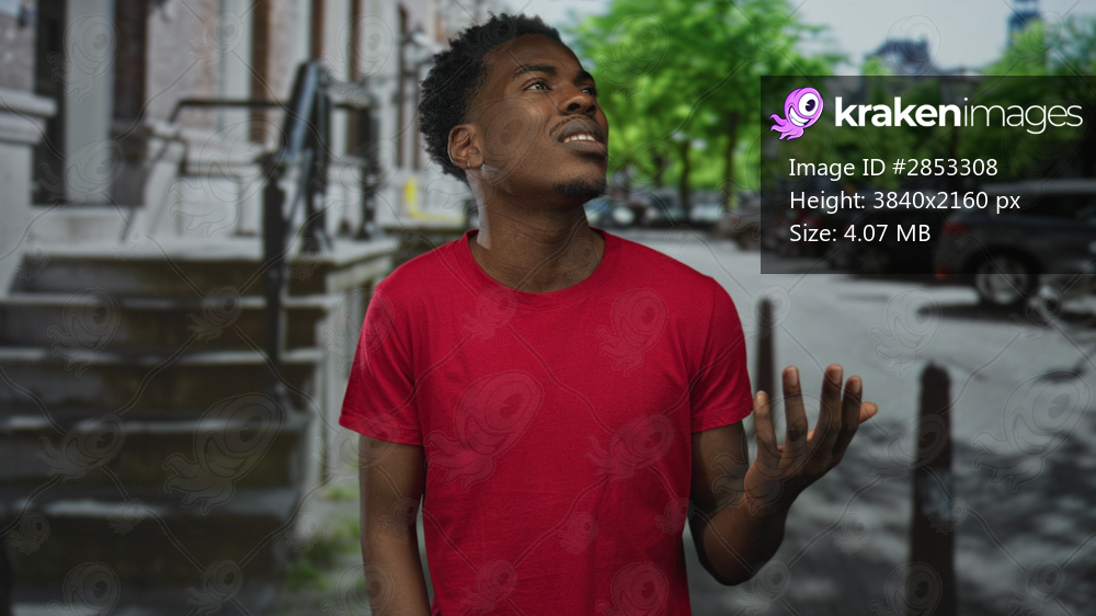 Man in red shirt raises open palm gesture in front of parked cars on city street while glancing aside; concern.