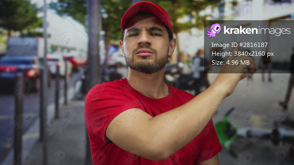 Man in red shirt and red cap holds one hand raised with finger pointing to object on urban street with blurred pedestrians; determination.