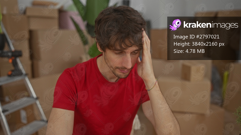 Man in red shirt rests hand on head amid unpacked cardboard boxes in building with ladder; uncertainty.