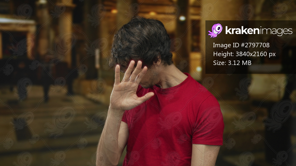 Man in red shirt shielding palm against bright light under church columns in building; contemplation.