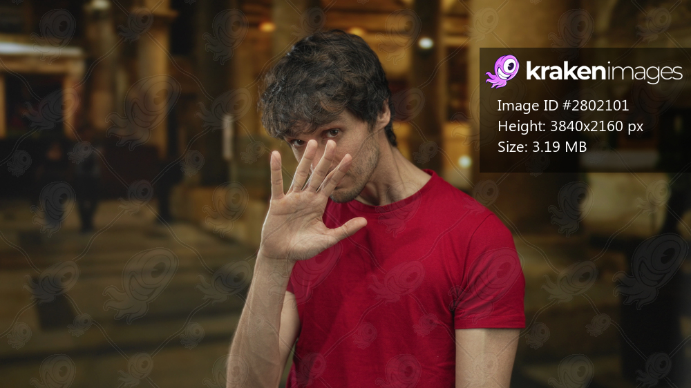 Man in red shirt shielding palm against bright light under church columns in building; contemplation.
