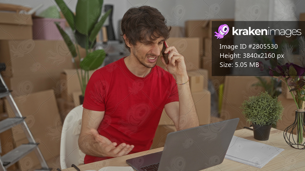 Man in red shirt sitting at desk pointing finger to laptop amid cardboard boxes in new building; focus.