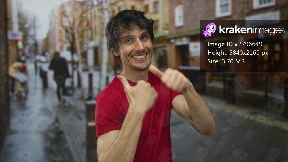 Man in red shirt smiling broadly points finger upward on damp city street lined with brick buildings; excitement.