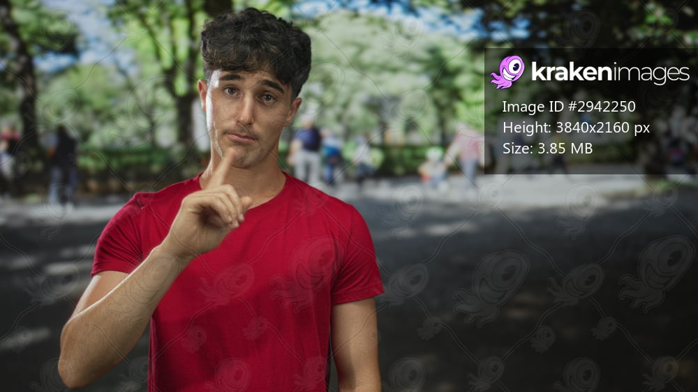 Man in red shirt wearing casual tshirt points finger upward on street amid park trees and sunlit path; calm reflection.