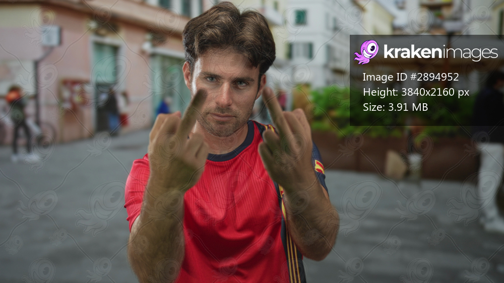 Man in red soccer jersey raises both middle fingers toward camera on a cobbled street with bare forearms visible; defiance rivalry.