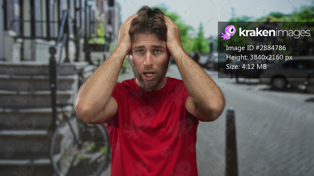 Man in red t shirt holds head with both hands on a cobblestone street by bicycles and parked cars, mouth open and eyes tense; stress.