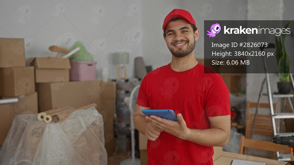 Man in red uniform taps tablet amid moving boxes in building interior; confidence reliability service.