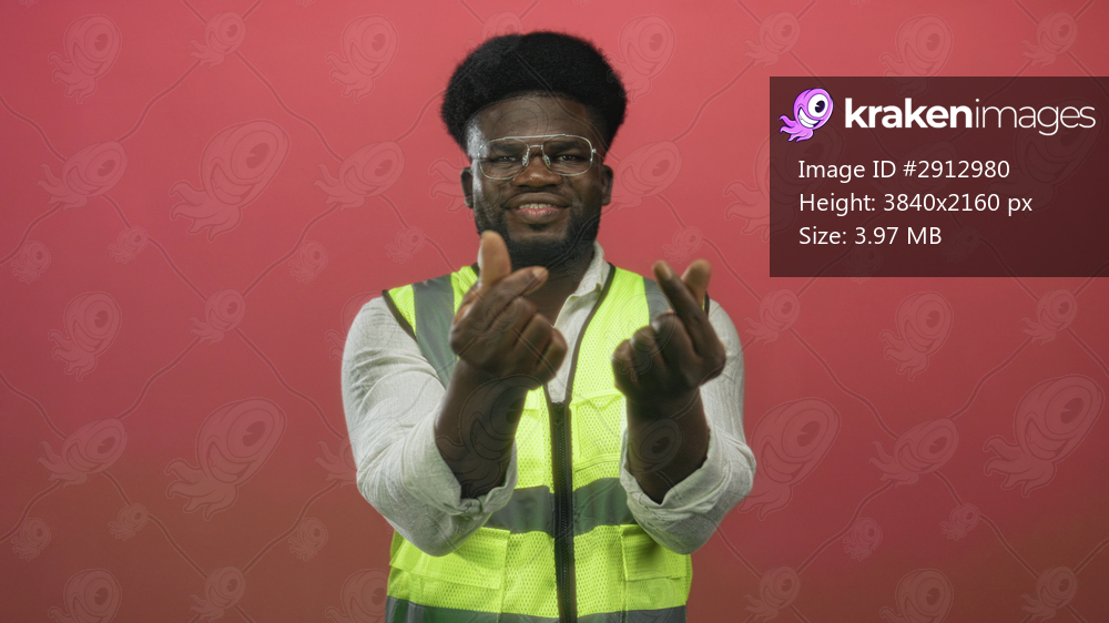 Man in reflective safety vest making finger heart gesture with both hands in studio red wall; affection.