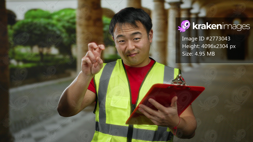 Man in safety vest poses with clipboard at university courtyard, blending academic setting with casual inspection theme, surrounded by historical architecture. - Kraken Images