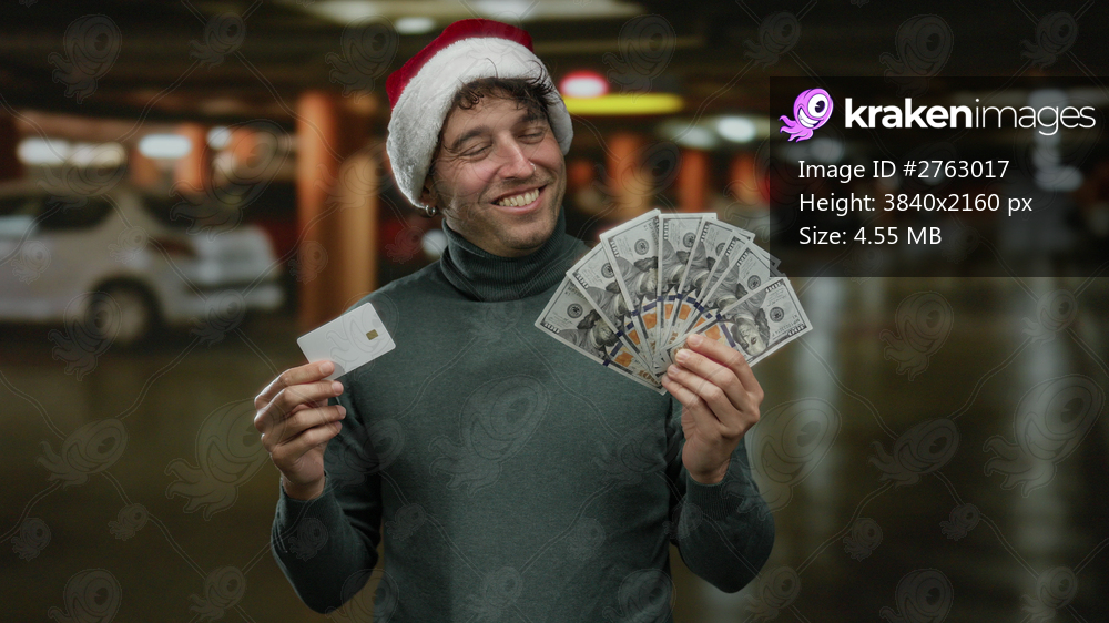 Man in santa hat smiling in a parking garage while holding us dollars and a credit card, representing holiday shopping and joy.