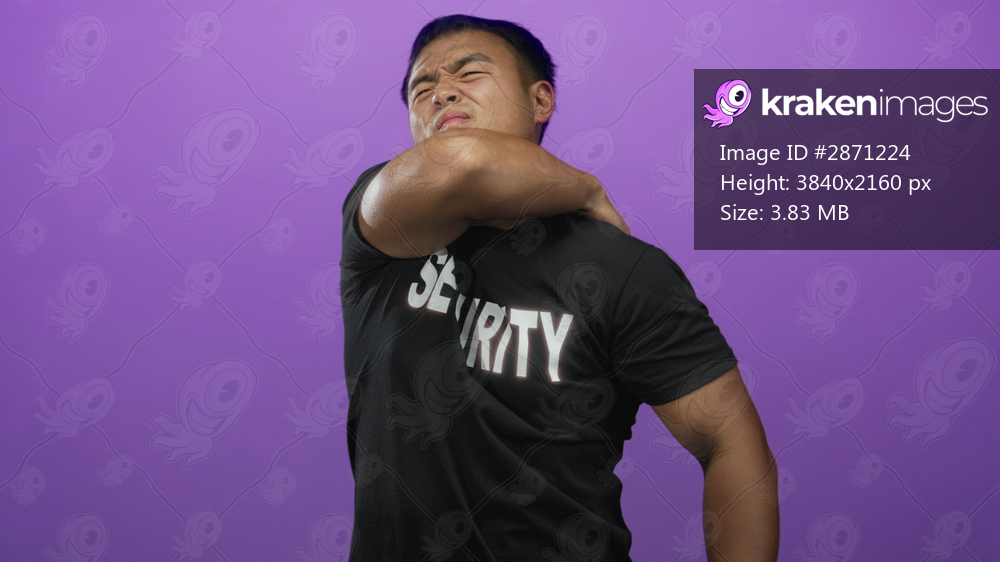 Man in security guard shirt clutches shoulder against vibrant purple background in studio; physical discomfort strain ache.