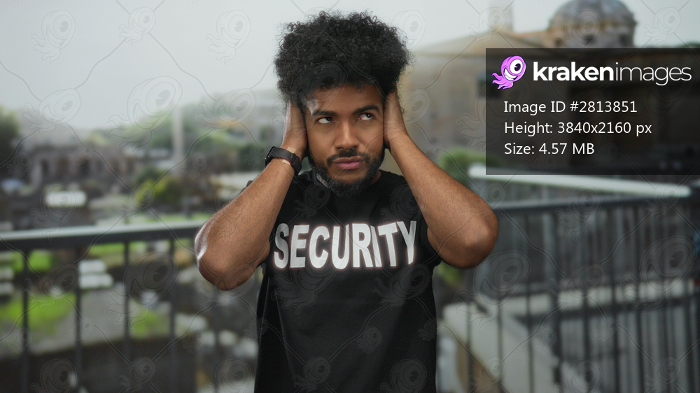 Man in security uniform covering ears in ancient roman ruins street capturing urban city noise context and outdoor environment.