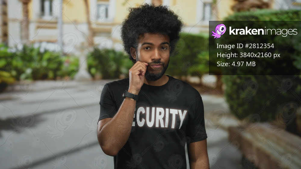Man in security uniform stands outdoors in a city street, surrounded by greenery, making a quiet gesture with a thoughtful expression on his face.