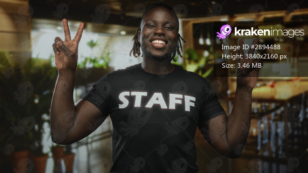 Man in staff shirt smiling and raising both hands in peace sign inside restaurant building; cheerful welcome.