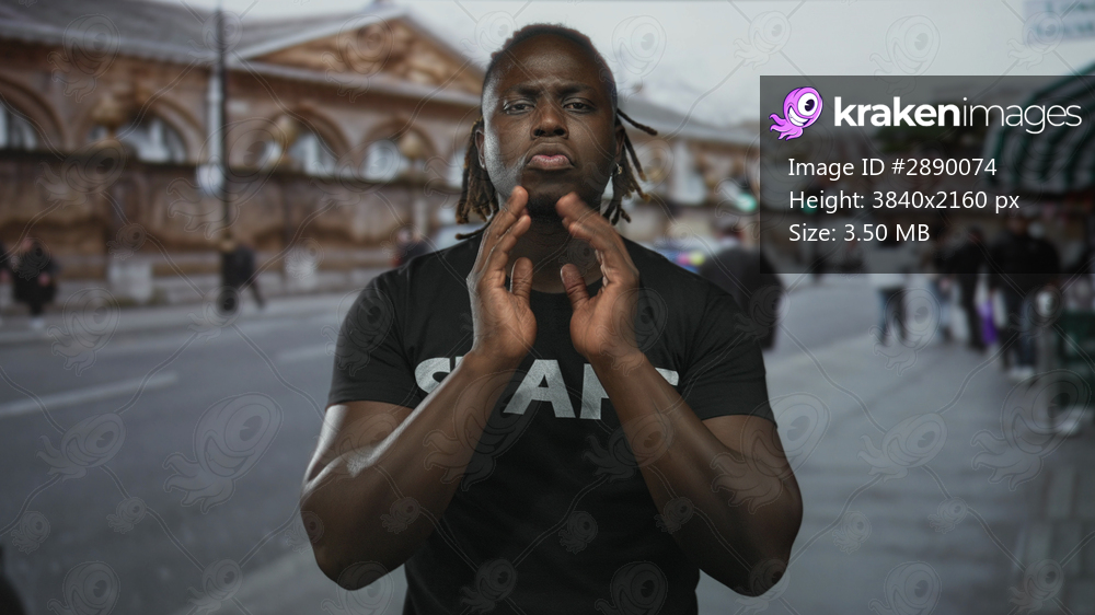 Man in staff t shirt rubs cheek with hand on busy city street near cars and pedestrians, mouth set in concentration; focus duty.