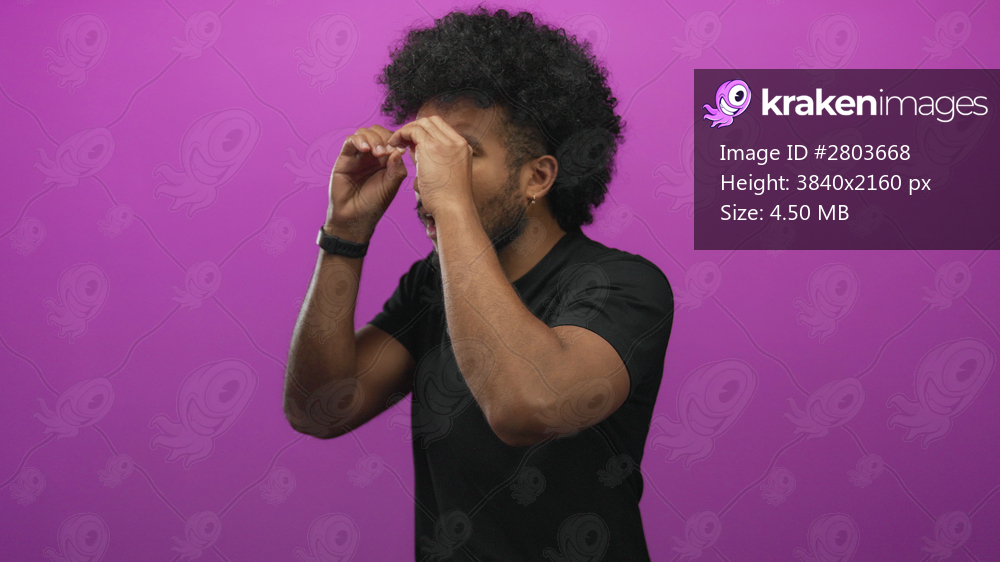 Man in staff uniform gestures binoculars with hands against a vibrant pink background, conveying curiosity and focus.