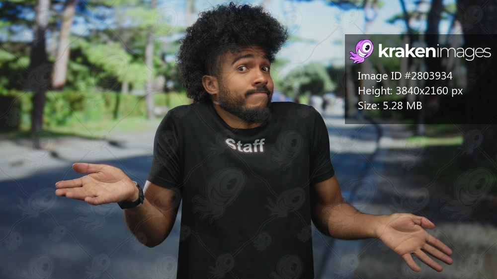 Man in staff uniform standing in green park outdoors with hands in shrug gesture, expressing confusion or uncertainty in natural environment setting.