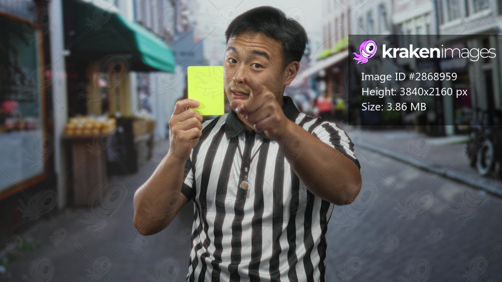 Man in striped referee shirt raises yellow card with whistle hanging from neck on city street; discipline.
