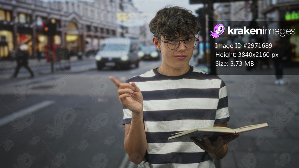 Man in striped shirt and glasses holds open book and points thumb over shoulder on busy city street; uncertainty study.