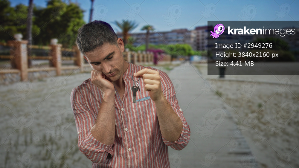 Man in striped shirt holding keys on keyring with hand on cheek on street looking down, pensive expression; lost home sadness.