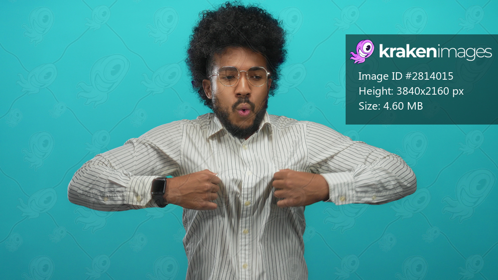 Man in striped shirt looking hot with gestures of fanning himself against a vibrant green background, embodying a humorous expression of heat.